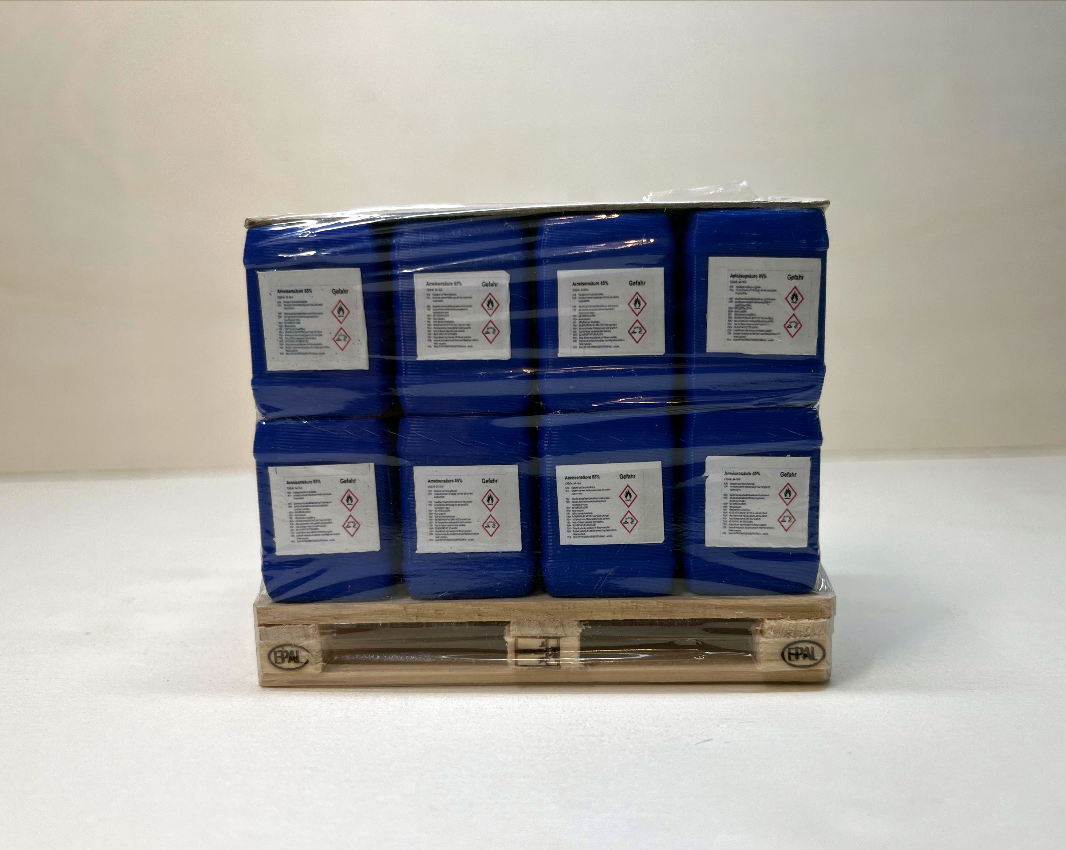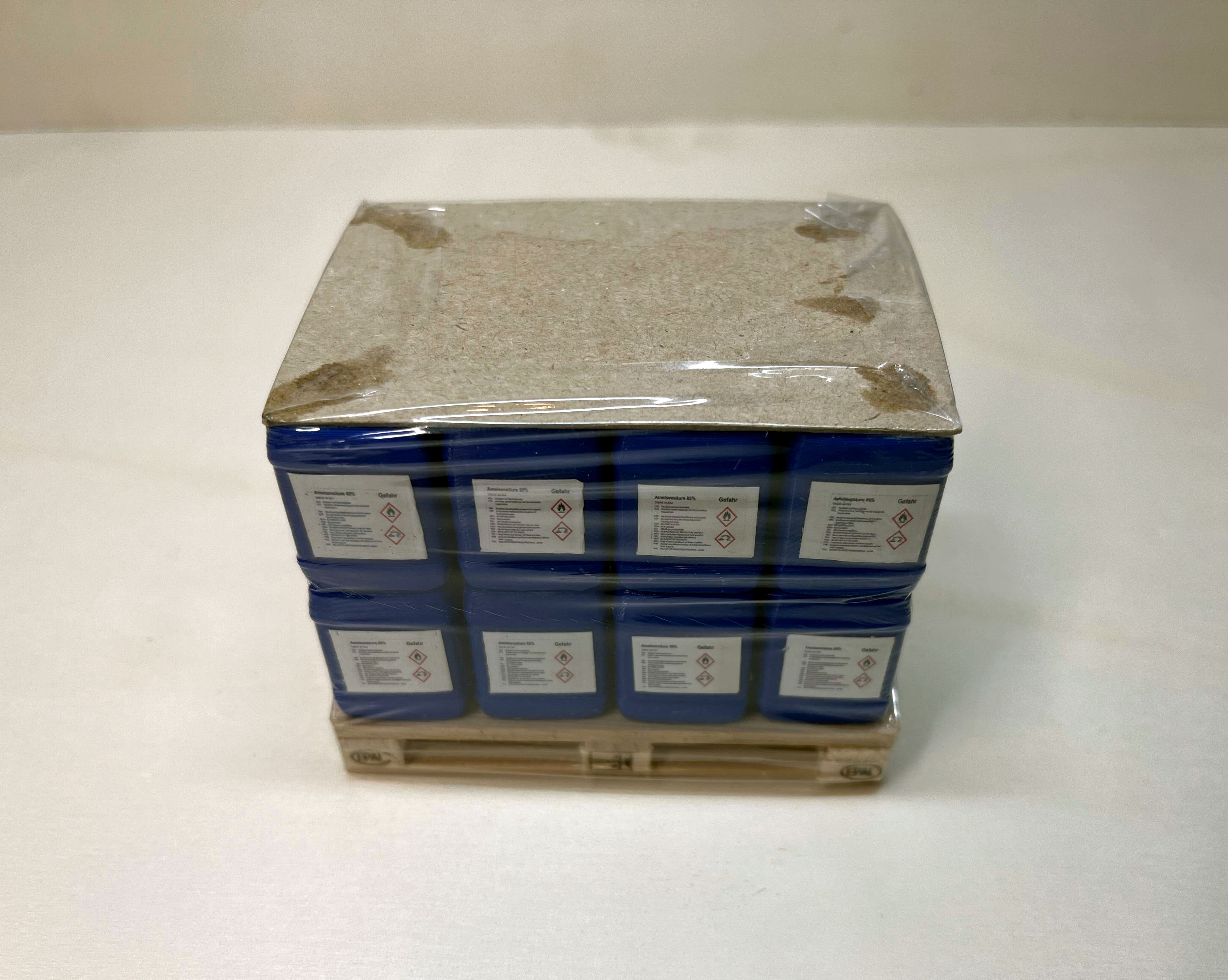Gestapelte Kanister (blau, 20 Ltr.) aus Kunststoff auf einer Euro-Palette.